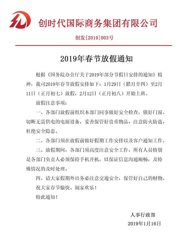创时代集团公司2019年春节放假通知