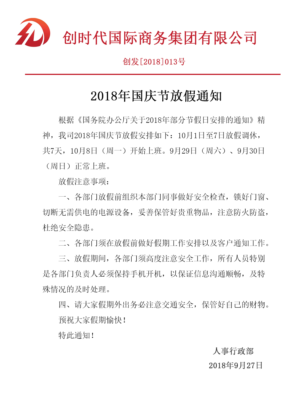 创时代集团公司2018年国庆节放假通知